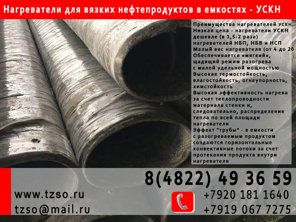 стеклокомпозитный нагреватель (УСКН) предназначен для разогрева и поддержания температуры вязких нефтепродуктов, битума, гудрона, мазута, масла, агрессивных диэлектрических сред в емкостях, хранилищах, цистернах, различных резервуарах, а также воздушных и невзрывоопасных газовых сред.